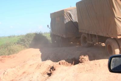 Die erste Kilometer hinter Poipet liessen uns schon boeses ahnen, eine ehemals asphaltierte Strasse mit Schlagloechern ueberseht war unsere Strecke fuer die ersten 35km. Das war zwar nicht sonderlich angenehm, aber nichts im Vergleich was danach die naechsten 100km auf uns zukam. Der Fahrer war immer zuegig unterwegs und liess auch nur wenige Schlagloecher aus.Wie gesagt nach Sisiphon kam der wirkliche harte Teil der Strecke. Eine Schotterpiste mit Schlagloechern so gross das man ohne Porbleme Lastwagen darin verstecken konnte